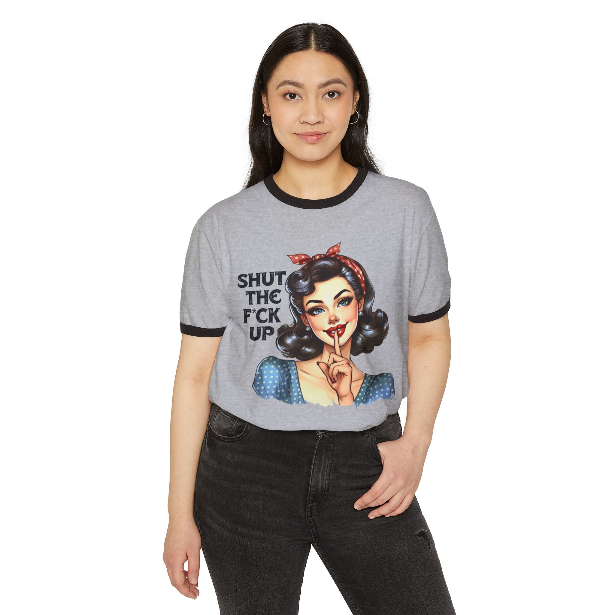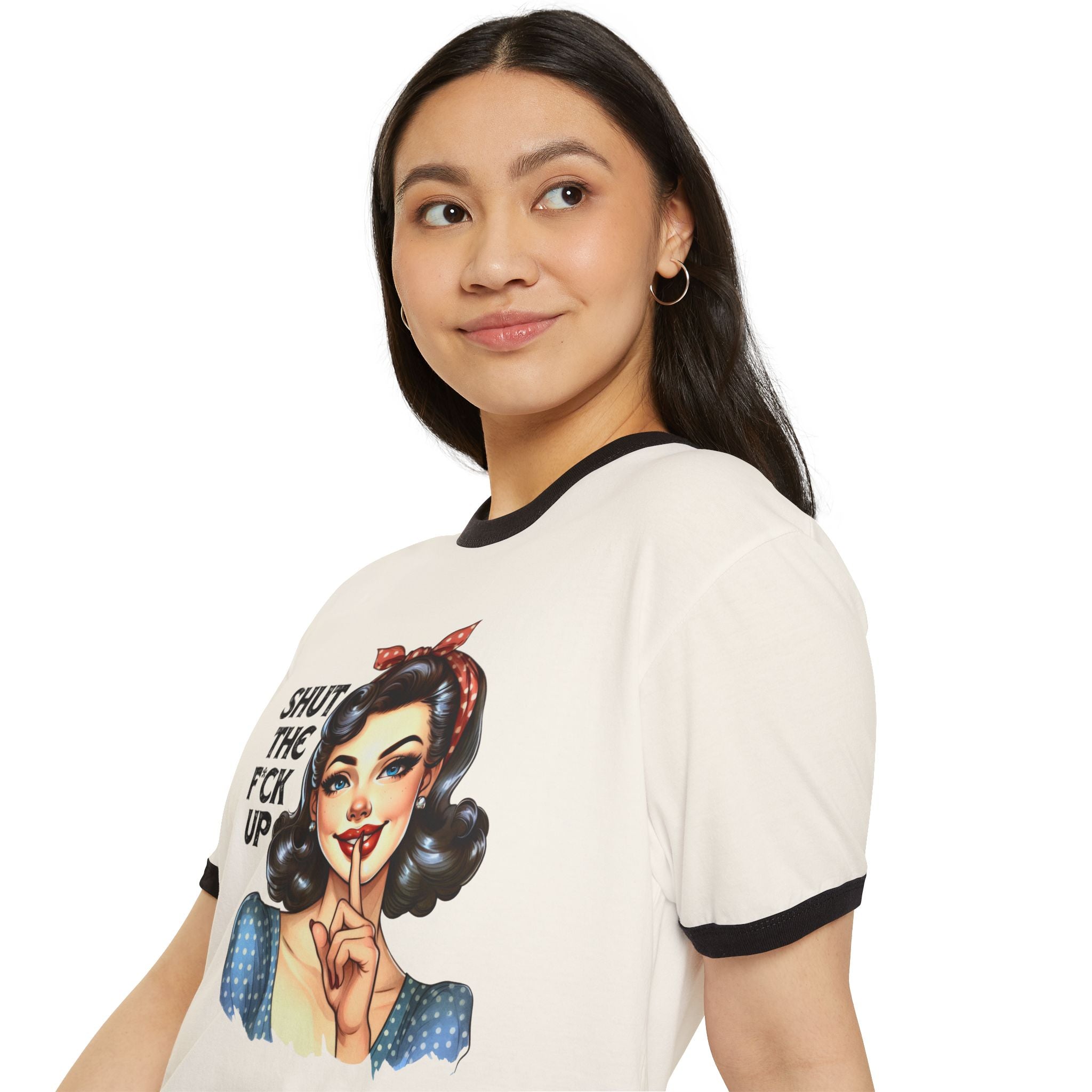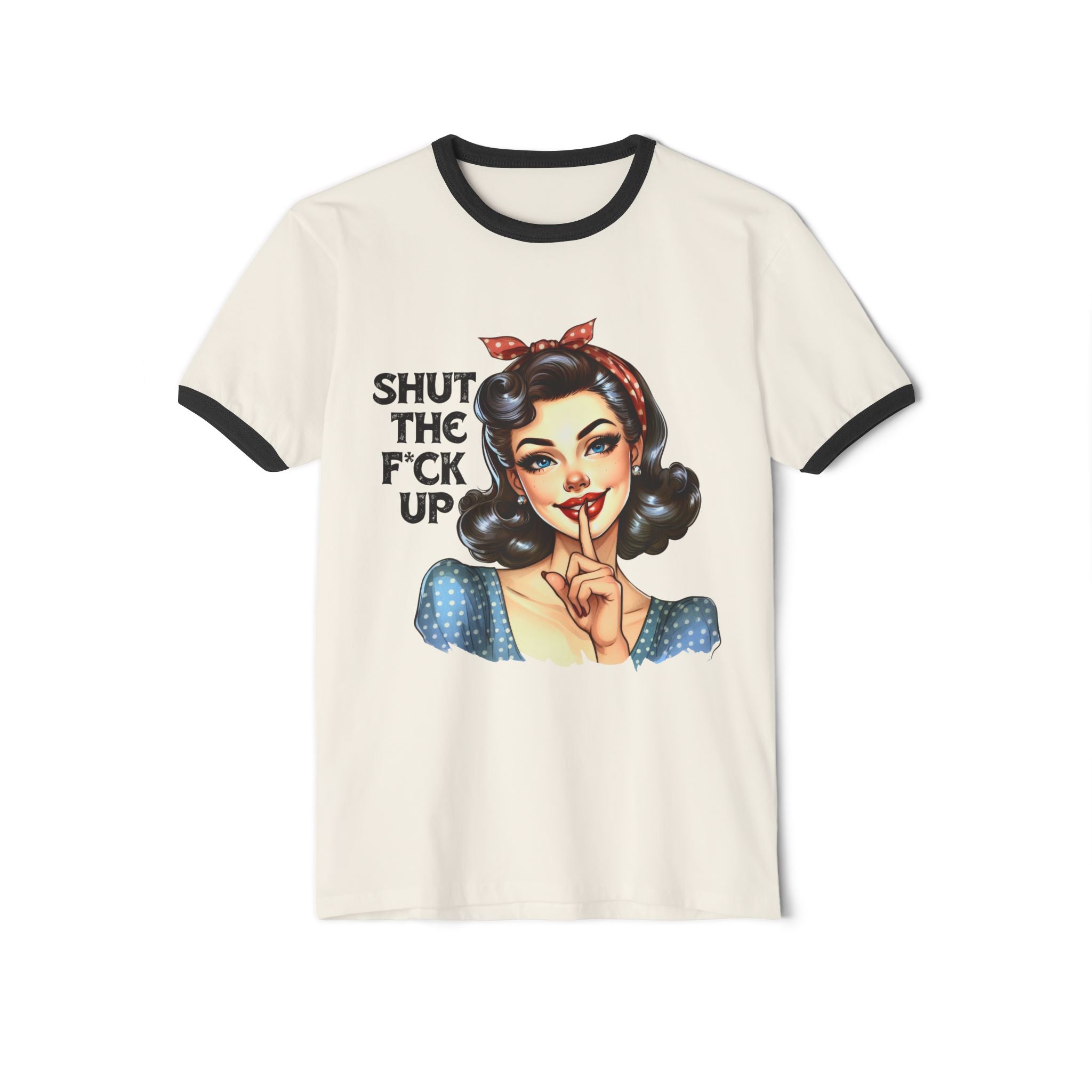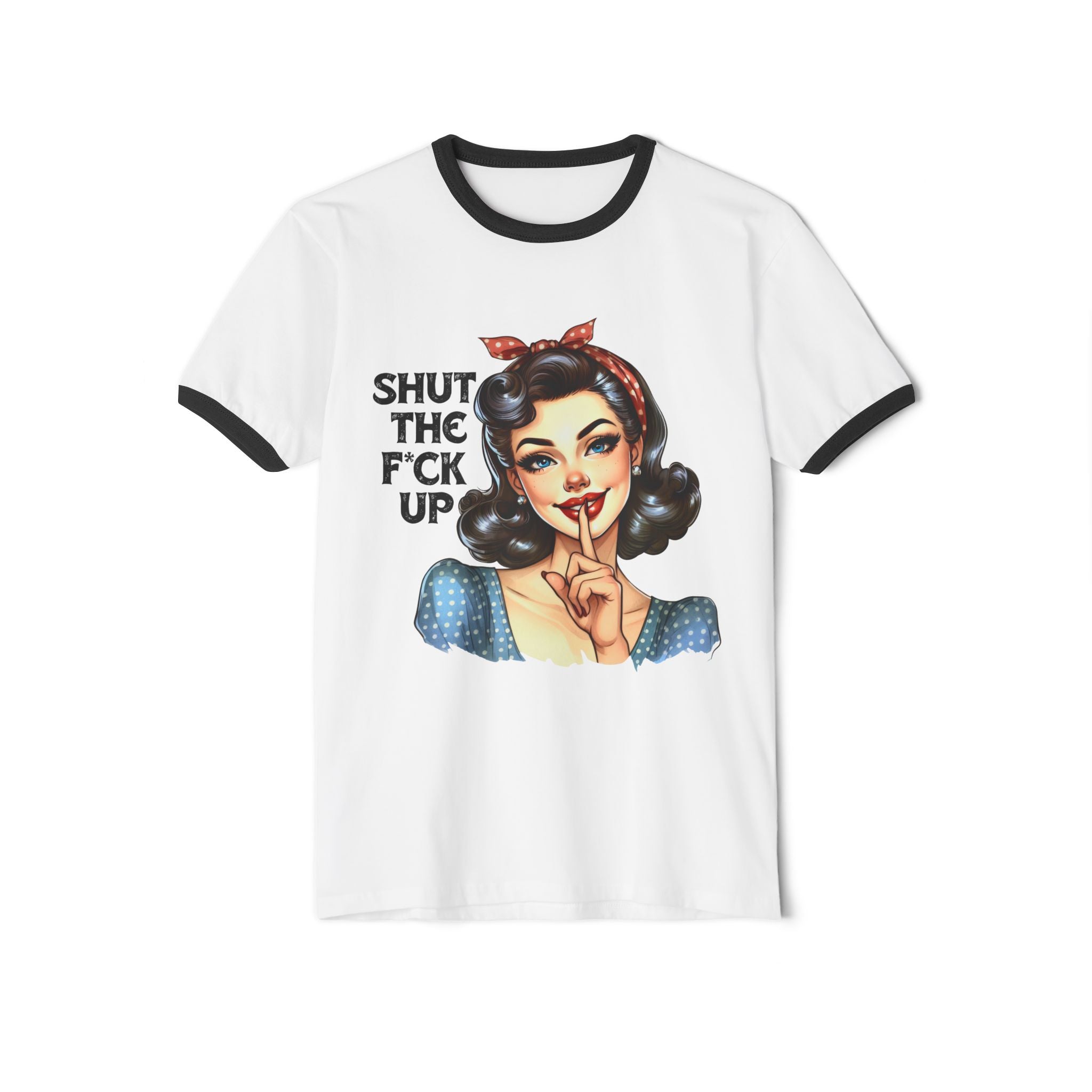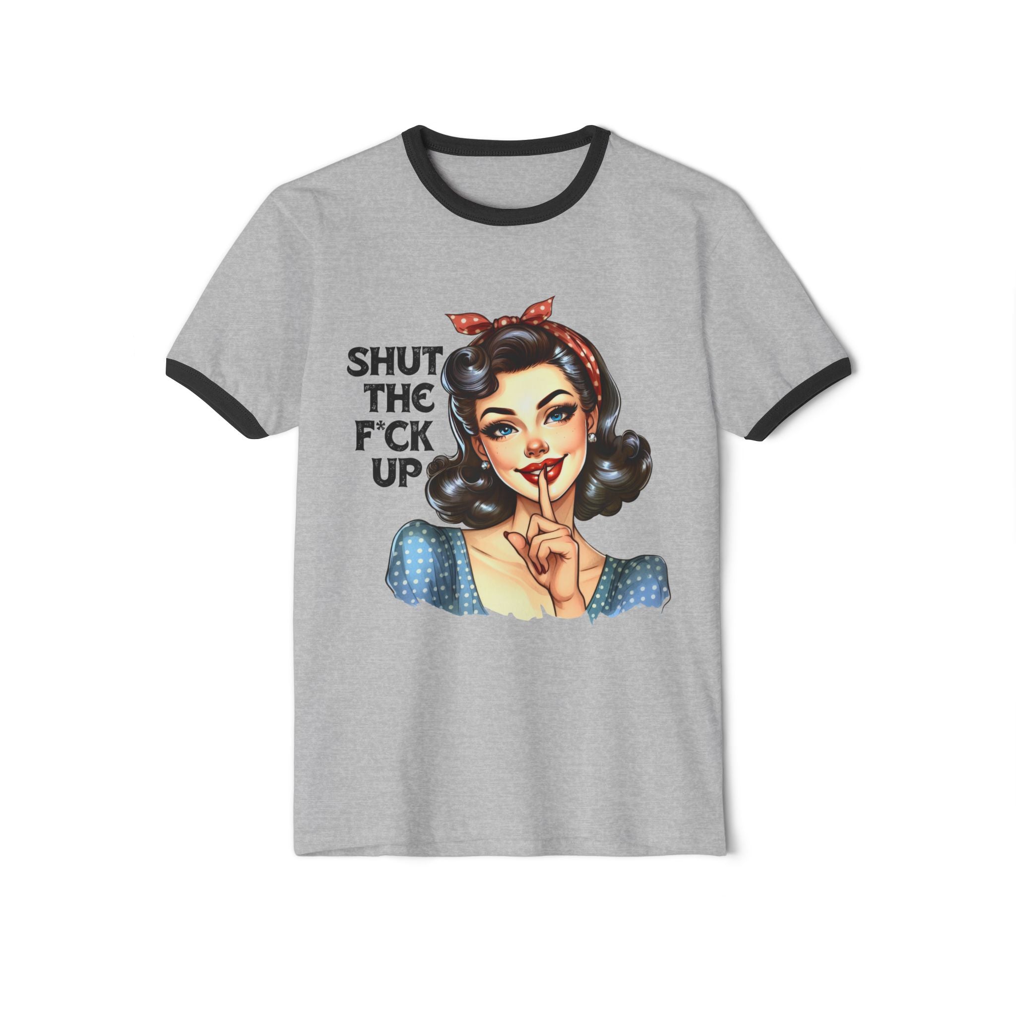Loud print, louder message. This unisex ringer tee comes with a cheeky pinup babe holding a finger to her lips and a whole lotta attitude: “Shut the F*ck Up.” Whether you're telling the world to pipe down or just rocking your inner savage in style, this one’s made to make a statement without saying a word.
